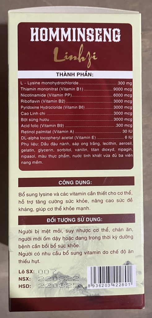 L-lysin monohydrochloride 300mg; vitamin B1 9000mcg; vitamin PP 6000mcg; vitamin B2 3000mcg; vitamin B6 3000mcg; cao linh chi 3000mcg; bột sừng hươu 3000mcg; acid folic 300mcg; vitamin A 30IU; vitamin E 6 IU