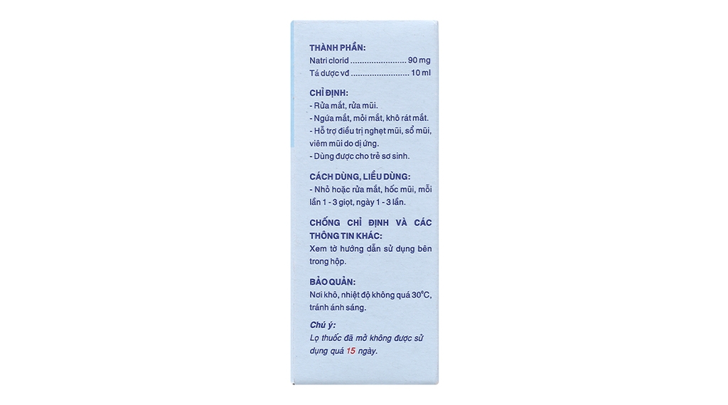 Nhỏ hoặc rửa mắt, hốc mũi, mỗi lần 1 - 3 giọt, ngày 1 - 3 lần.